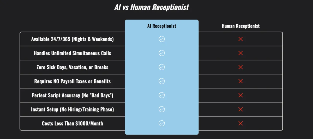 The best part? You save thousands every month compared to hiring a full-time receptionist, which typically costs $3,000–$4,000+ per month when you include salary, taxes, and benefits. With our AI system, you get 24/7 coverage, faster response times, and no missed calls, all for a fraction of the cost.